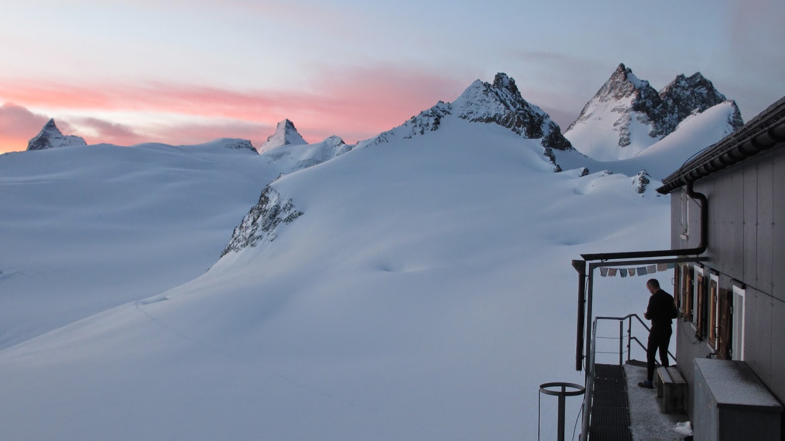 Atardecer desde la Cabane de Bertol. Dent d’Herens y Cervino de fondo |