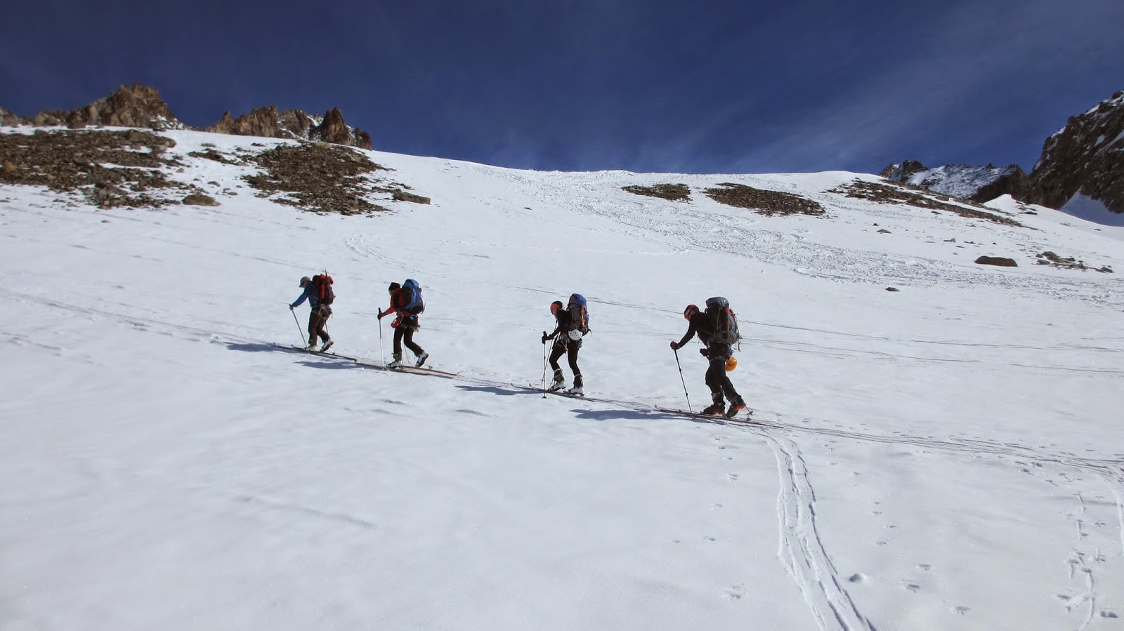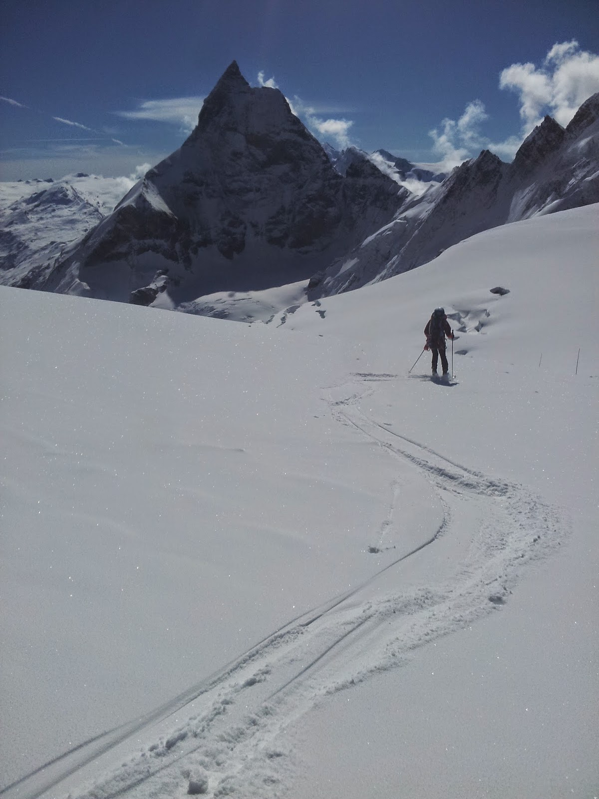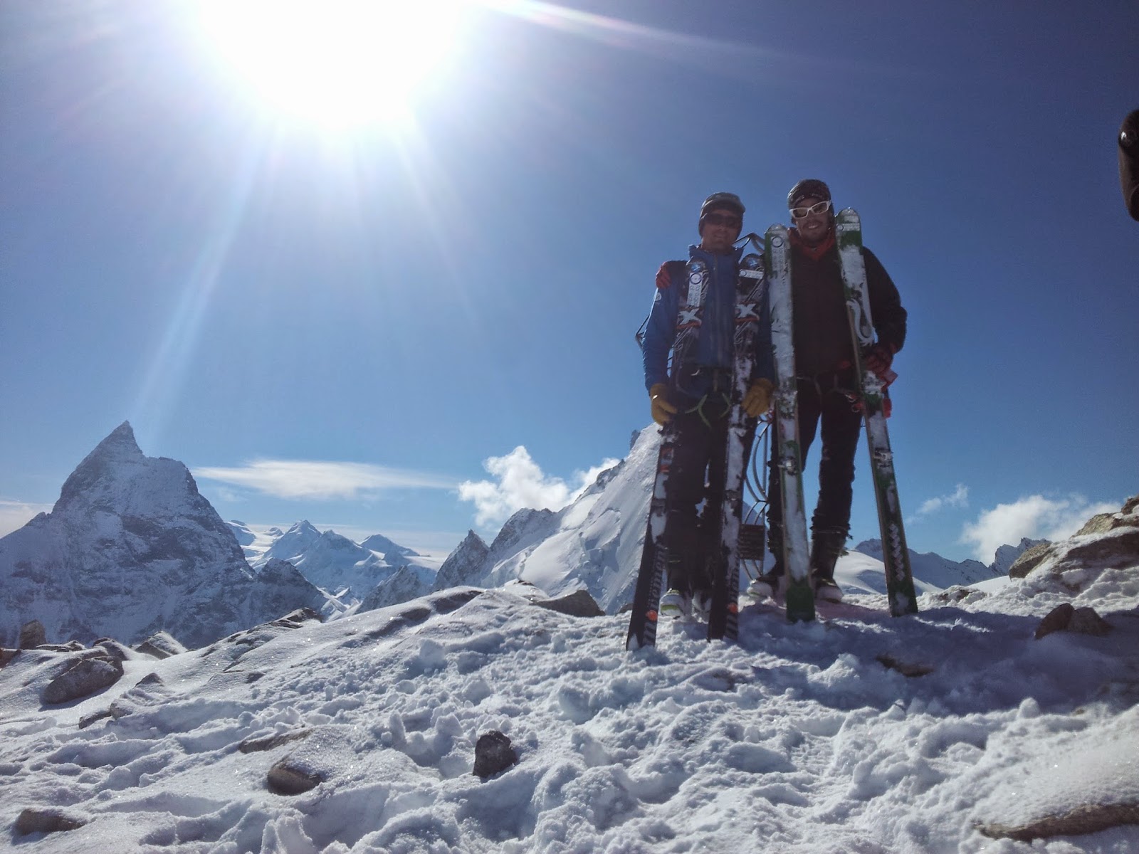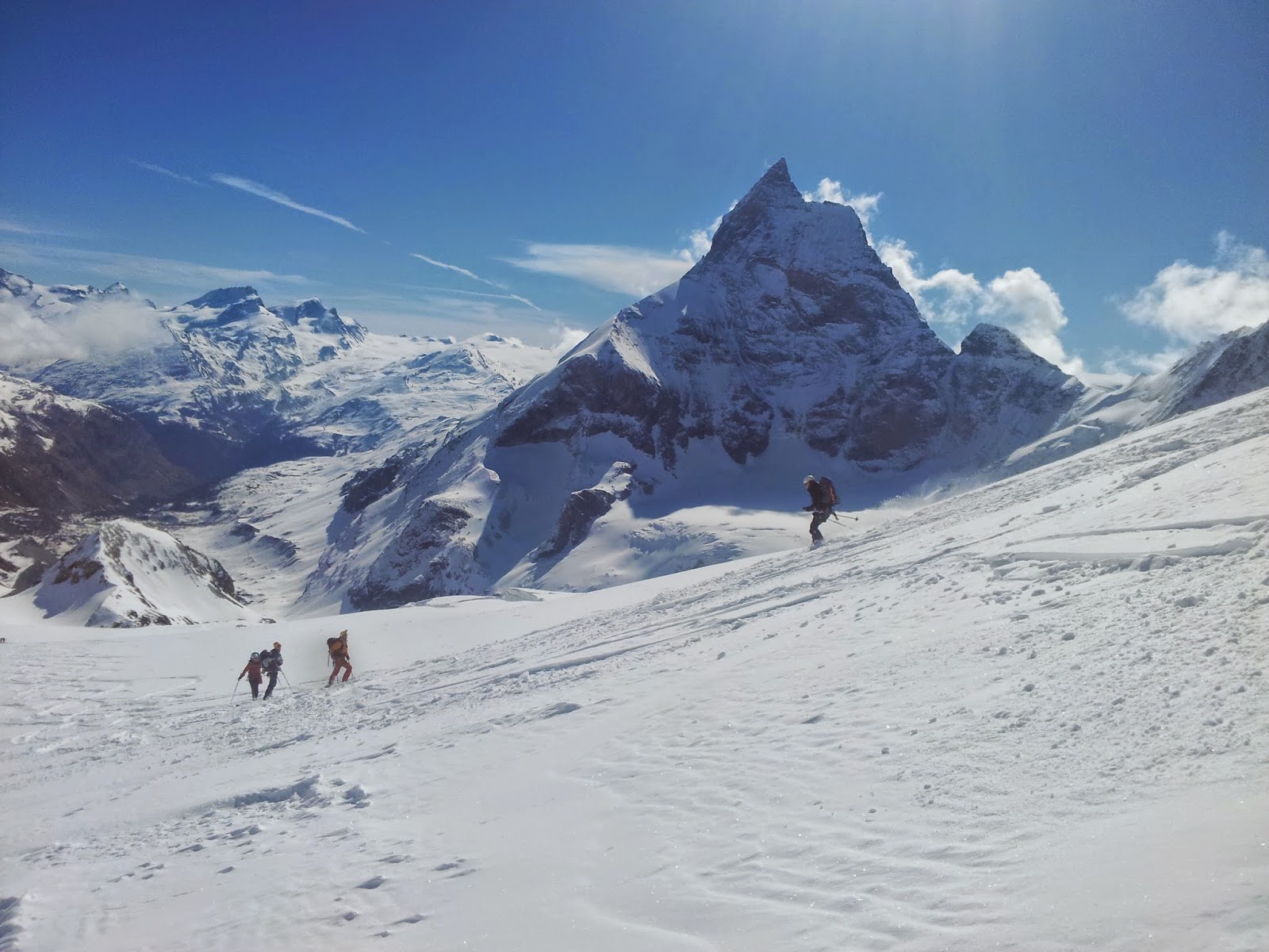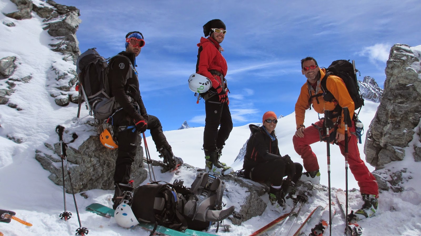 El equipo en el Col de Bertol con el Cervino asomando en el horizonte |